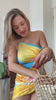 Ruched asymmetric bust with cutout at waist. Open back with elasticized straps and translucent stoppers. Mini-length hem with raw edge finish.