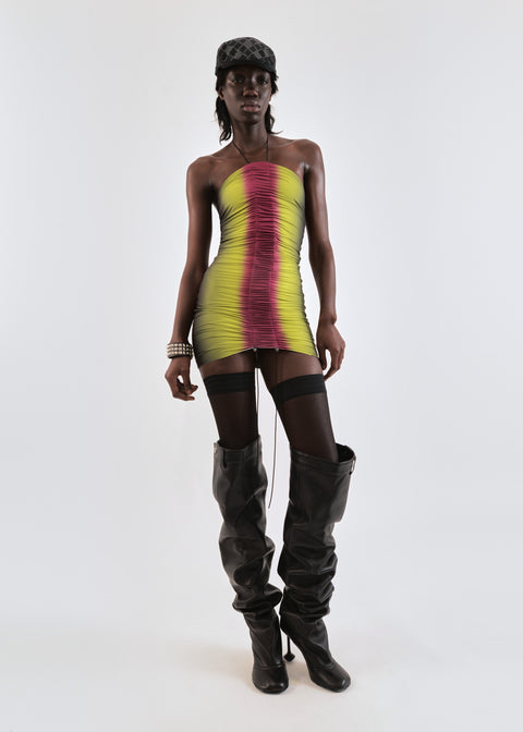 Gathered mini dress in lime/wine