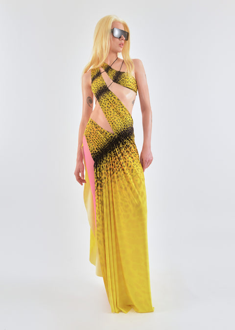 Wrap-around dress in yellow leopard