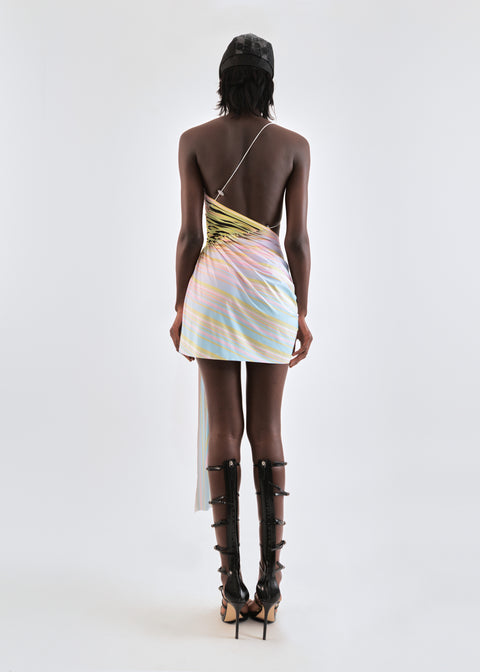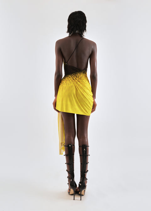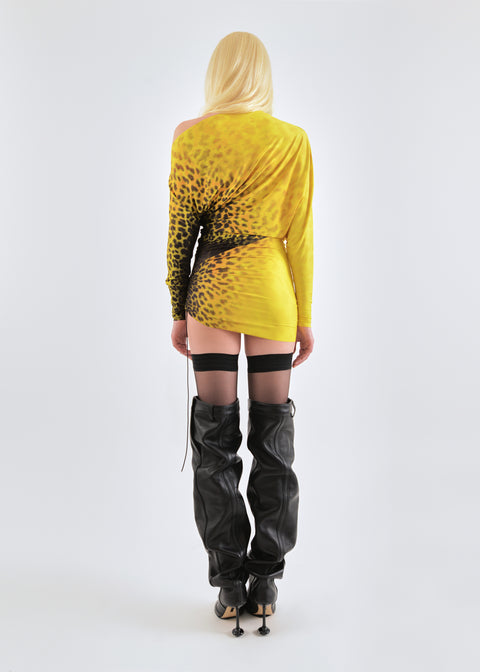 Draped shell mini dress in yellow leopard