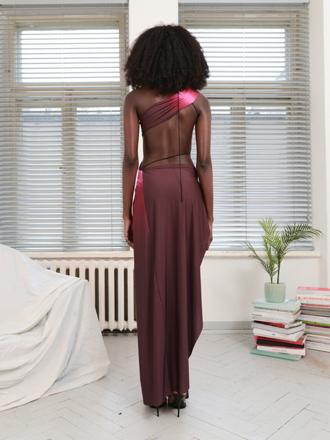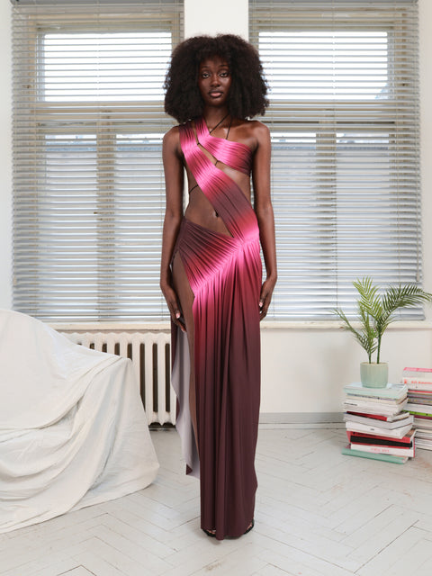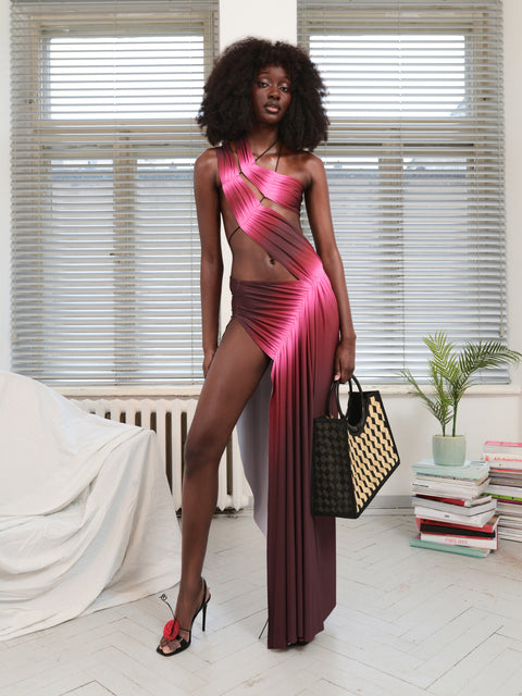 The wrap-around dress is constructed through a process of draping the fabric around the body. It is engineered on a base of strings that hold the fabric gathered in strategic places. The gatherings serve as the centerpiece of color gradients that infuse the garment with depth and saturation.
