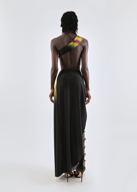 Long ruched dress made of printed jersey. Stretchy fabric. Asymmetric construction. Black elastics throughout. Tonal seams.