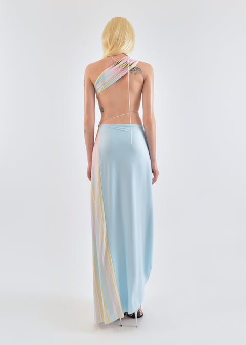 The wrap-around dress is constructed through a process of draping the fabric around the body. It is engineered on a base of strings that hold the fabric gathered in strategic places. The gatherings serve as the centerpiece of color gradients that infuse the garment with depth and saturation.