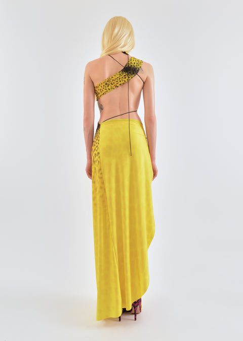 The wrap-around dress is constructed through a process of draping the fabric around the body. It is engineered on a base of strings that hold the fabric gathered in strategic places. The gatherings serve as the centerpiece of color gradients that infuse the garment with depth and saturation.